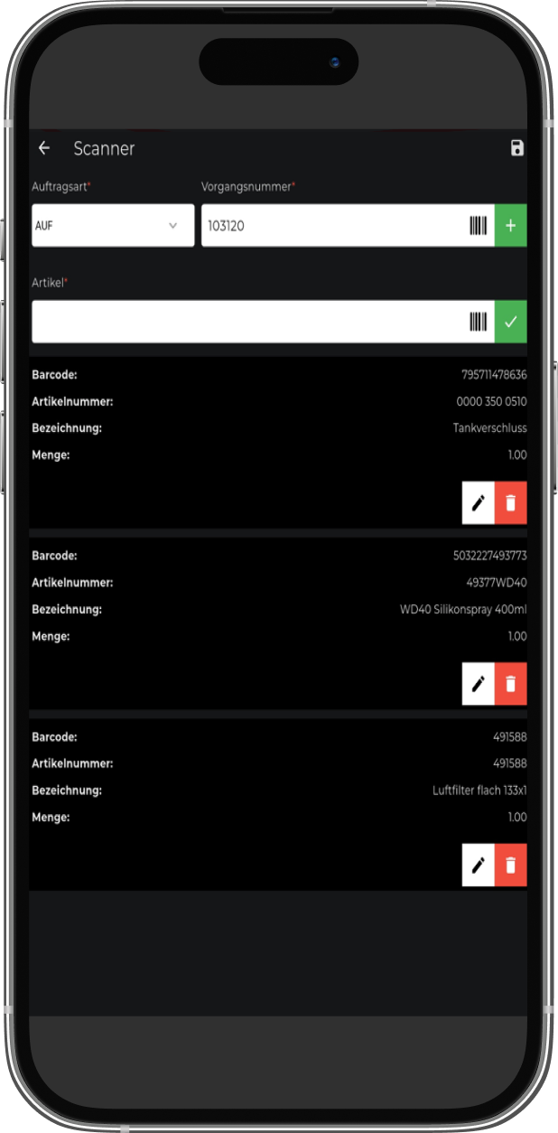 Sie scannen Artikel direkt mit dem Smartphone oder Tablet ein. Diese können im Anschluss im Warenwirtschaftssystem zu verschiedenen Vorgängen, zum Beispiel Aufträge, Bestellungen, Inventur, importiert werden.